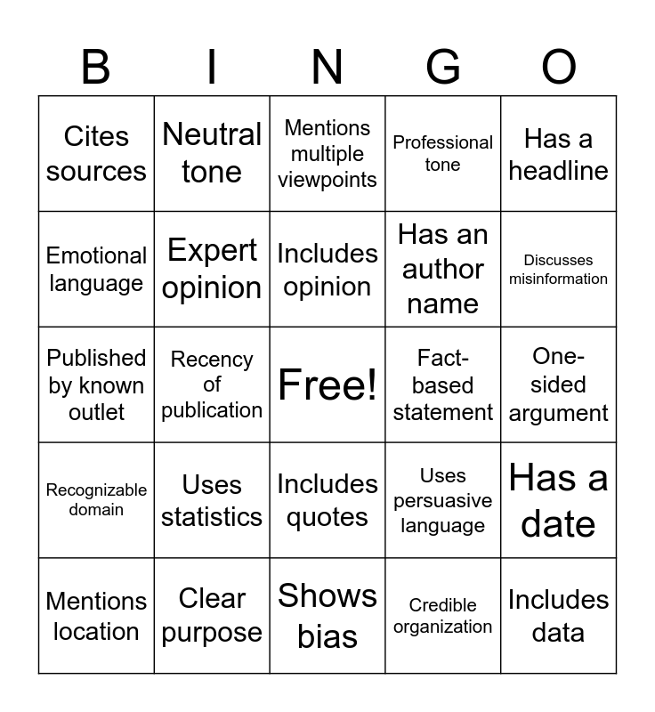 This bingo card has a free space and 25 words: Uses statistics, Shows bias, Includes opinion, Mentions location, Has a headline, Cites sources, Emotional language, Neutral tone, Fact-based statement, Includes quotes, Has an author name, Published by known outlet, Uses persuasive language, Has a date, Expert opinion, Includes images out of context, One-sided argument, Mentions multiple viewpoints, Discusses misinformation, Recency of publication, Includes data, Clear purpose, Recognizable domain, Professional tone and Credible organization.
