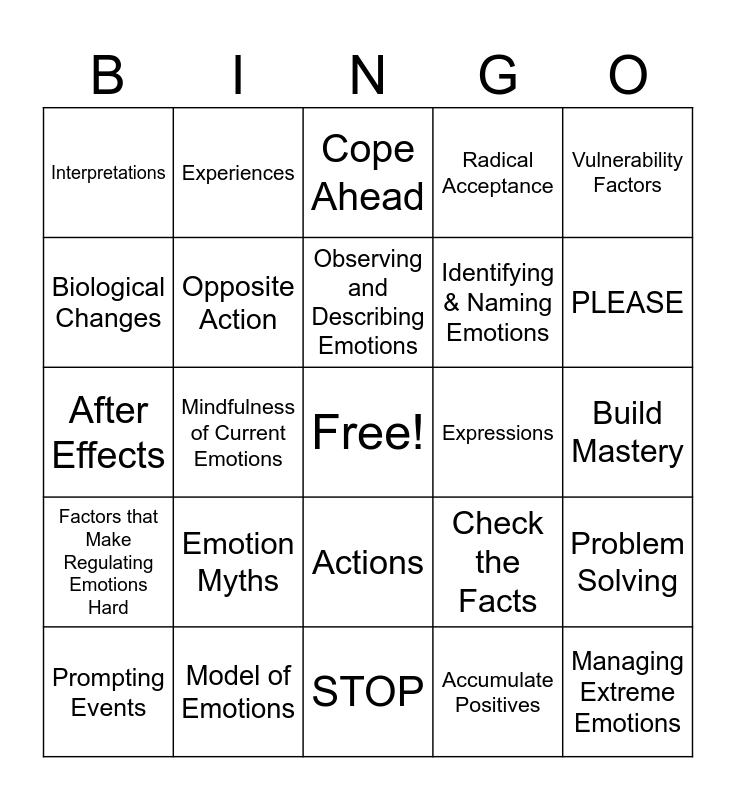 This bingo card has a free space and 24 words: Emotion Myths, Model of Emotions, Observing and Describing Emotions, Prompting Events, Vulnerability Factors, Interpretations, Biological Changes, Experiences, Expressions, Actions, Identifying & Naming Emotions, After Effects, Check the Facts, Problem Solving, Opposite Action, Accumulate Positives, Build Mastery, Cope Ahead, PLEASE, Mindfulness of Current Emotions, Managing Extreme Emotions, Factors that Make Regulating Emotions Hard, Radical Acceptance and STOP.