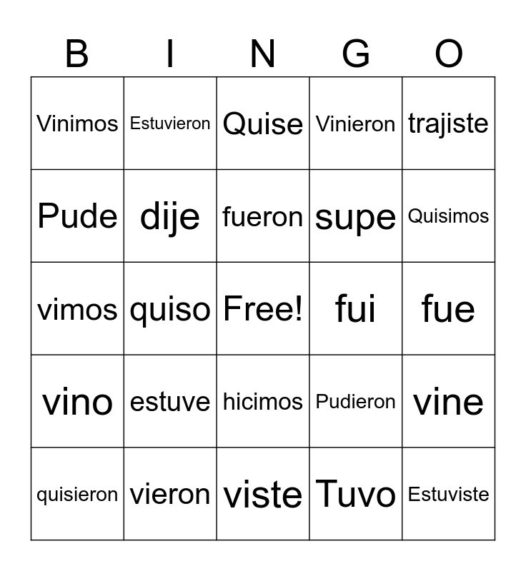 This bingo card has a free space and 91 words: quiso, traje, hicimos, produje, fuiste, puse, quisimos, hizo, anduvieron, quise, tuvieron, fui, fuiste, fue, fuimos, fueron, di, diste, dio, dimos, dieron, vi, viste, vio, vimos, vieron, hice, Hiciste, Hizo, hicimos, hicieron, vine, viniste, vino, Vinimos, Vinieron, Quise, tú quisiste, quiso, Quisimos, quisieron, Pude, pudiste, Pudo, Pudimos, Pudieron, puse, pusiste, puso, Pusimos, Pusieron, supe, supiste, supo, Supimos, Supieron, fui, fuiste, fue, fueron, anduve, Anduviste, Anduvo, Anduvimos, Anduvieron, tuve, tuviste, Tuvo, Tuvimos, Tuvieron, estuve, Estuviste, Estuvo, Estuvimos, Estuvieron, dije, Dijiste, Dijo, Dijimos, Dijeron, traje, trajiste, Trajo, Trajimos, Trajeron, Produje, produjiste, Produjo, Produjimos, Produjeron and fuimos.