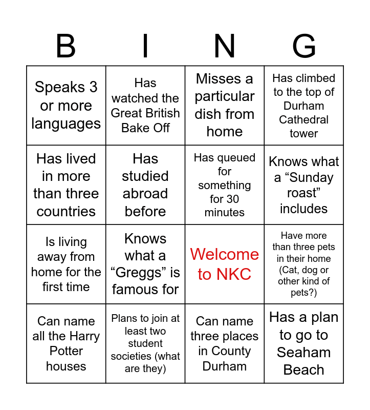 This bingo card has 16 words: Plans to join at least two student societies (what are they), Have more than three pets in their home (Cat, dog or other kind of pets?), Misses a particular dish from home, Speaks 3 or more languages, Is living away from home for the first time, Has watched the Great British Bake Off, Welcome to NKC, Can name three places in County Durham, Has lived in more than three countries, Has studied abroad before, Can name all the Harry Potter houses, Has climbed to the top of Durham Cathedral tower, Knows what a “Greggs” is famous for, Knows what a “Sunday roast” includes, Has queued for something for 30 minutes and Has a plan to go to Seaham Beach.