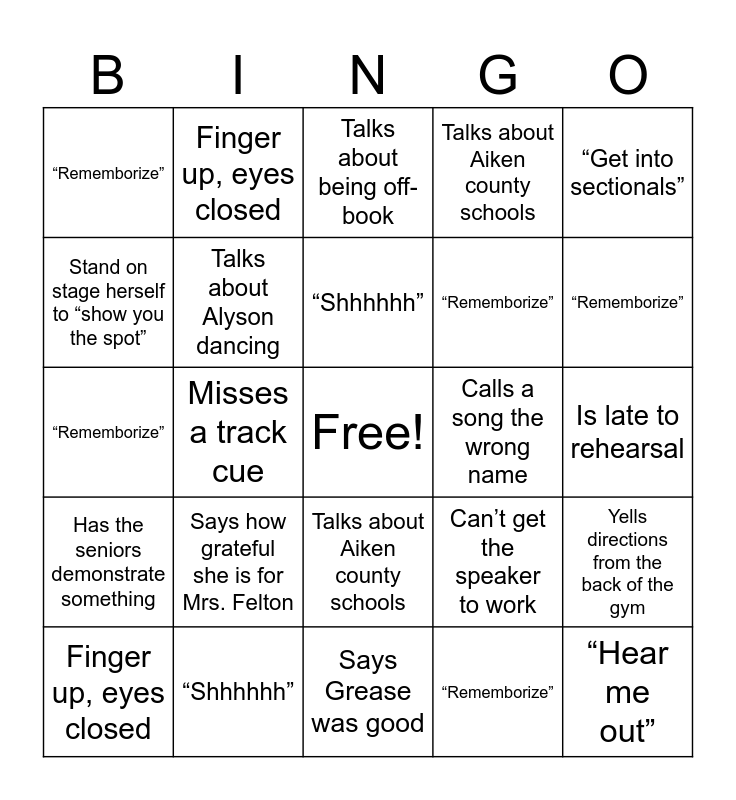 ⚠ This card has duplicate items: “Rememborize” (8), “Hear me out” (2), Says Grease was good (2), Says how grateful she is for Mrs. Felton (2), Finger up, eyes closed (2), Talks about being off-book (2), Stand on stage herself to “show you the spot” (2), Talks about Alyson dancing (2), Talks about Aiken county schools (2), Yells directions from the back of the gym (2), Can’t get the speaker to work (2), Talks about how dances in Grease were boring (2), “Shhhhhh” (2), Calls a song the wrong name (2), Calls a character the wrong name (2), “Get into sectionals” (2), Misses a track cue (2)
