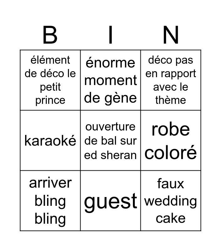 This bingo card has a free space and 8 words: robe coloré, déco pas en rapport avec le thème, énorme moment de gène, arriver bling bling, élément de déco le petit prince, faux wedding cake, karaoké and guest.