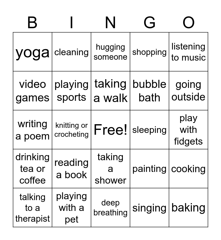 This bingo card has a free space and 25 words: reading a book, deep breathing, taking a walk, talking to a therapist, listening to music, yoga, video games, cleaning, sleeping, taking a shower, bubble bath, writing a poem, painting, cooking, playing sports, eating, play with fidgets, hugging someone, going outside, knitting or crocheting, baking, playing with a pet, drinking tea or coffee, shopping and singing.