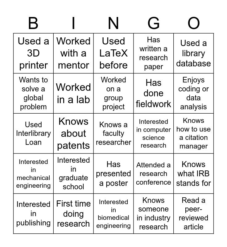 This bingo card has a free space and 24 words: Interested in publishing, Interested in graduate school, Worked on a group project, Knows someone in industry research, Used a library database, Used a 3D printer, Worked with a mentor, Used LaTeX before, Interested in computer science research, Knows how to use a citation manager, Used Interlibrary Loan, Worked in a lab, Attended a research conference, Knows what IRB stands for, Wants to solve a global problem, First time doing research, Interested in biomedical engineering, Has written a research paper, Enjoys coding or data analysis, Interested in mechanical engineering, Knows about patents, Has presented a poster, Has done fieldwork and Read a peer-reviewed article.