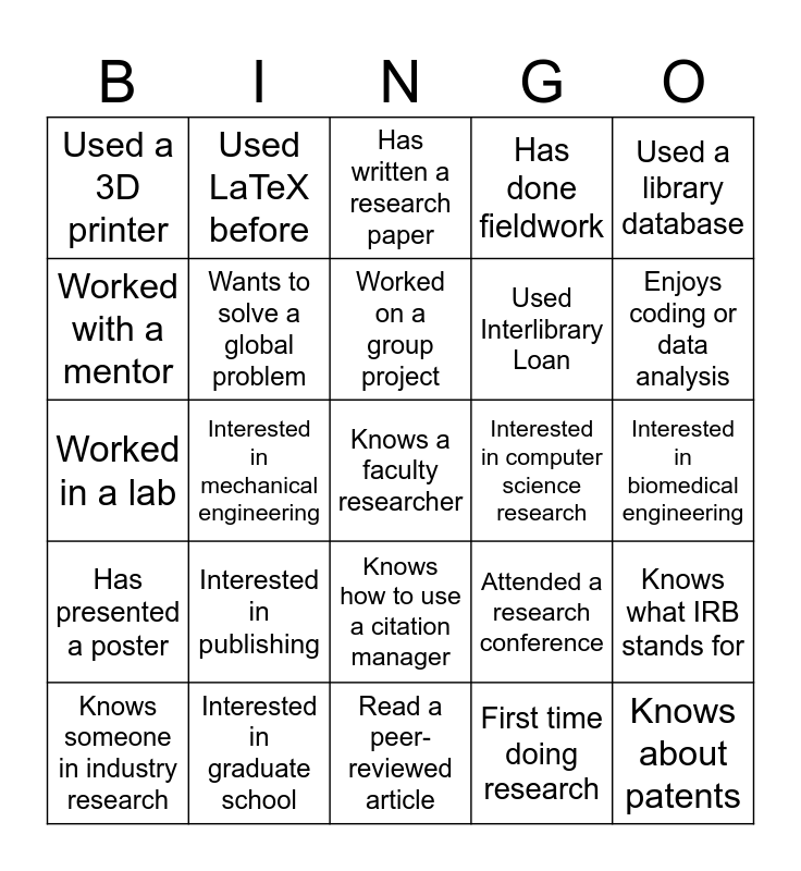 This bingo card has a free space and 24 words: Interested in publishing, Interested in graduate school, Worked on a group project, Knows someone in industry research, Used a library database, Used a 3D printer, Worked with a mentor, Used LaTeX before, Interested in computer science research, Knows how to use a citation manager, Used Interlibrary Loan, Worked in a lab, Attended a research conference, Knows what IRB stands for, Wants to solve a global problem, First time doing research, Interested in biomedical engineering, Has written a research paper, Enjoys coding or data analysis, Interested in mechanical engineering, Knows about patents, Has presented a poster, Has done fieldwork and Read a peer-reviewed article.
