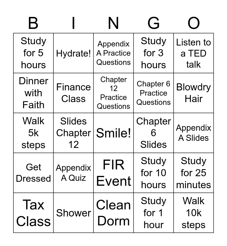 This bingo card has a free space and 24 words: Appendix A Quiz, Shower, Chapter 12 Practice Questions, Tax Class, Listen to a TED talk, Study for 5 hours, Dinner with Faith, Hydrate!, Chapter 6 Slides, FIR Event, Chapter 6 Practice Questions, Walk 5k steps, Study for 10 hours, Study for 25 minutes, Finance Class, Study for 1 hour, Appendix A Slides, Appendix A Practice Questions, Blowdry Hair, Slides Chapter 12, Walk 10k steps, Get Dressed, Study for 3 hours and Clean Dorm.