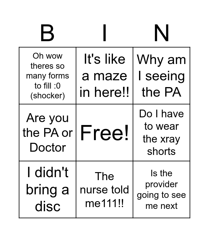 This bingo card has a free space and 8 words: Do I have to wear the xray shorts, Why am I seeing the PA, It's like a maze in here!!, I didn't bring a disc, Oh wow theres so many forms to fill :0 (shocker), Is the provider going to see me next, Are you the PA or Doctor and The nurse told me111!!.