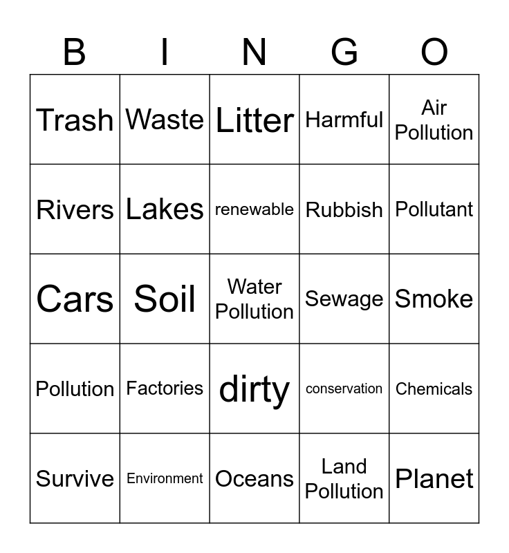 This bingo card has 25 words: Pollution, Environment, Water Pollution, Land Pollution, Air Pollution, Trash, Waste, Litter, Sewage, Chemicals, Rivers, Lakes, Oceans, conservation, Pollutant, Survive, Soil, renewable, Rubbish, Smoke, Cars, Factories, dirty, Harmful and Planet.