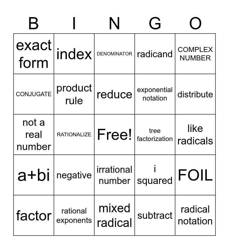 This bingo card has a free space and 24 words: negative, rational exponents, reduce, factor, COMPLEX NUMBER, exact form, CONJUGATE, index, tree factorization, irrational number, exponential notation, not a real number, i squared, FOIL, product rule, subtract, like radicals, DENOMINATOR, distribute, RATIONALIZE, radical notation, a+bi, radicand and mixed radical.