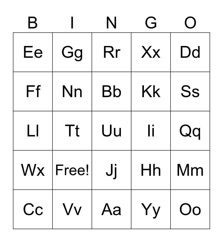 This bingo card has 25 words: Free!, Aa, Bb, Cc, Dd, Ee, Ff, Gg, Ii, Jj, Kk, Ll, Hh, Mm, Nn, Oo, Qq, Rr, Ss, Tt, Uu, Vv, Wx, Xx and Yy.