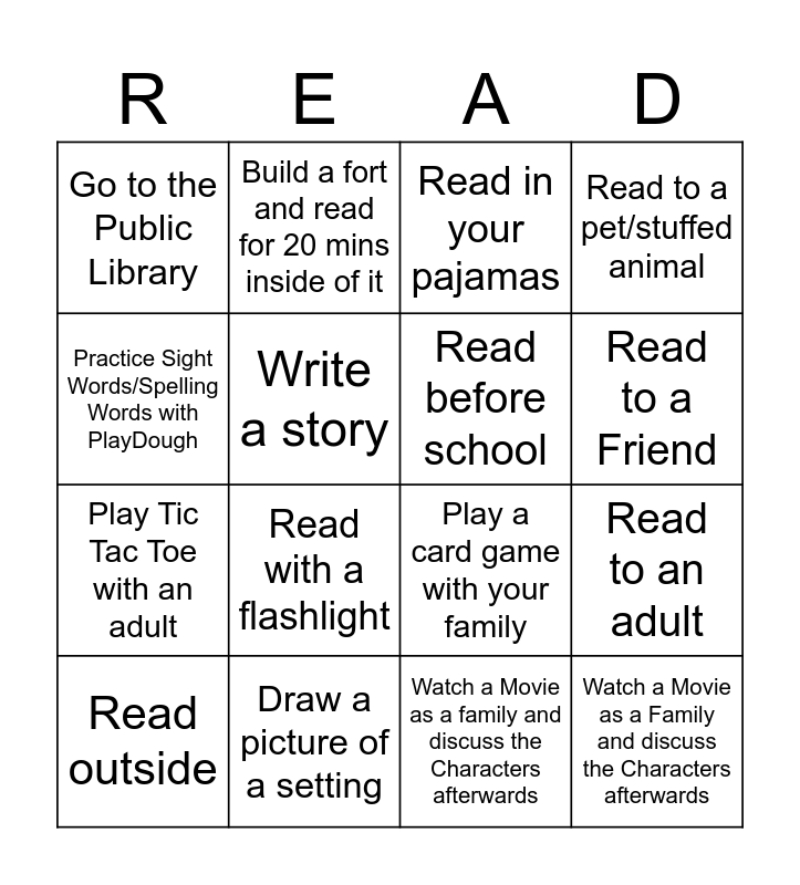 This bingo card has 17 words: Watch a Movie as a family and discuss the Characters afterwards, Read outside, Read in your pajamas, Go to the Public Library, Read with a flashlight, Read to a pet/stuffed animal, Read to an adult, Read before school, Read to a Friend, Write a story, Draw a picture of a setting, Play a card game with your family, Practice Sight Words/Spelling Words with PlayDough, Build a fort and read for 20 mins inside of it, Play Tic Tac Toe with an adult, Write a thank you letter to a Teacher and Watch a Movie as a Family and discuss the Characters afterwards.