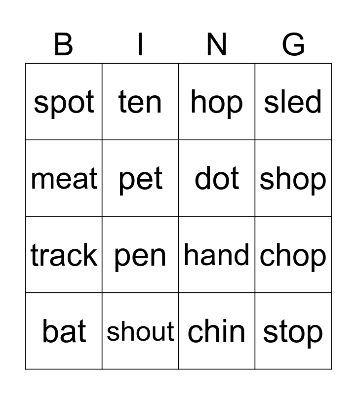 This bingo card has 16 words: shout, chop, hop, spot, track, ten, hand, chin, meat, pet, bat, sled, pen, shop, dot and stop.