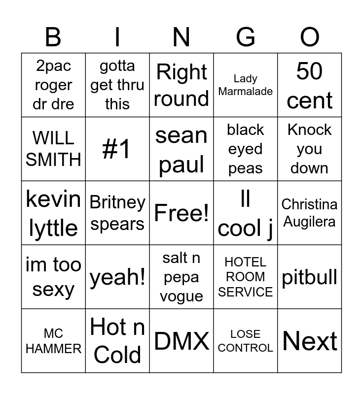 This bingo card has a free space and 29 words: MC HAMMER, Hypnotize, Britney spears, digital underground, 2pac roger dr dre, Right round, #1, yeah!, ll cool j, Hot n Cold, Christina Augilera, Next, DMX, LOSE CONTROL, Knock you down, Boom boom pow, salt n pepa vogue, im too sexy, 50 cent, kevin lyttle, HOTEL ROOM SERVICE, solider, black eyed peas, WILL SMITH, Lady Marmalade, gotta get thru this, pitbull, sean paul and eve.