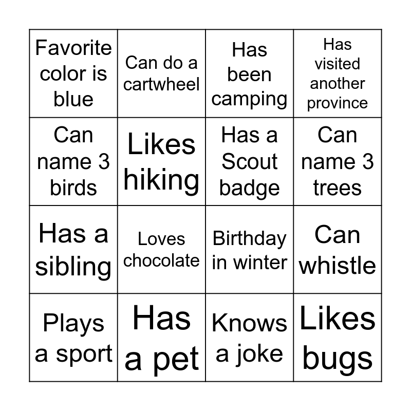 This bingo card has 16 words: Has a pet, Can whistle, Has been camping, Favorite color is blue, Has a sibling, Can do a cartwheel, Birthday in winter, Knows a joke, Can name 3 birds, Likes hiking, Plays a sport, Has visited another province, Loves chocolate, Can name 3 trees, Has a Scout badge and Likes bugs.
