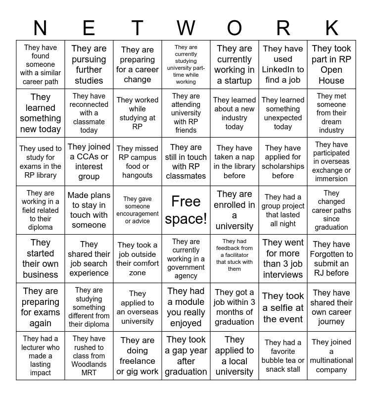 This bingo card has a free space and 48 words: They got a job within 3 months of graduation, They learned something unexpected today, They took a gap year after graduation, Made plans to stay in touch with someone, They missed RP campus food or hangouts, They changed career paths since graduation, They are pursuing further studies, They have rushed to class from Woodlands MRT, They have used LinkedIn to find a job, They are currently working in a government agency, They took part in RP Open House, They are currently studying university part-time while working, They have applied for scholarships before, They have taken a nap in the library before, They are preparing for exams again, They had a group project that lasted all night, They learned something new today, They met someone from their dream industry, They took a selfie at the event, They are currently working in a startup, They learned about a new industry today, They gave someone encouragement or advice, They have found someone with a similar career path, They have reconnected with a classmate today, They have shared their own career journey, They worked while studying at RP, They have participated in overseas exchange or immersion, They had a lecturer who made a lasting impact, They are still in touch with RP classmates, They joined a CCAs or interest group, They had a favorite bubble tea or snack stall, They are enrolled in a university, They have Forgotten to submit an RJ before, They are studying something different from their diploma, They are working in a field related to their diploma, They had feedback from a facilitator that stuck with them, They went for more than 3 job interviews, They used to study for exams in the RP library, They took a job outside their comfort zone, They applied to an overseas university, They started their own business, They joined a multinational company, They are preparing for a career change, They are doing freelance or gig work, They are attending university with RP friends, They had a module you really enjoyed, They shared their job search experience and They applied to a local university.