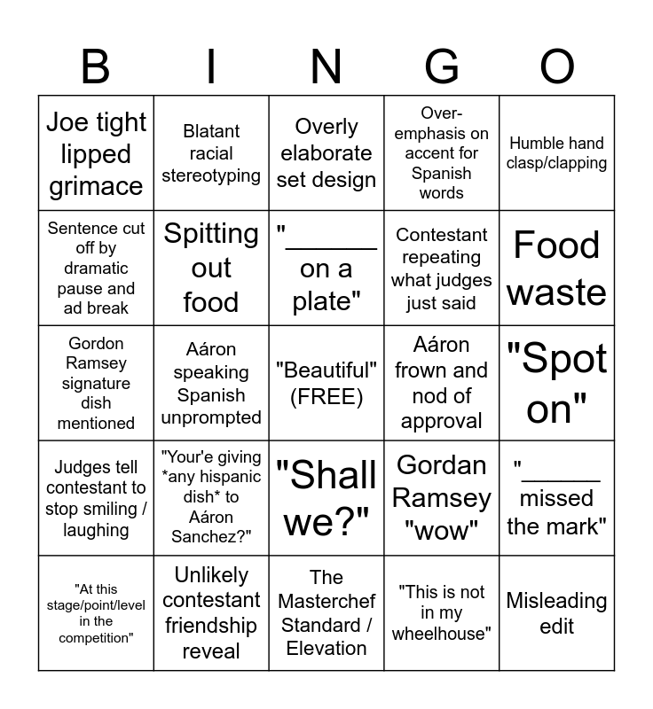 This bingo card has a free space and 24 words: "Your'e giving *any hispanic dish* to Aáron Sanchez?", Unlikely contestant friendship reveal, "______ on a plate", "At this stage/point/level in the competition", Humble hand clasp/clapping, Joe tight lipped grimace, Sentence cut off by dramatic pause and ad break, Blatant racial stereotyping, Aáron frown and nod of approval, "Shall we?", Contestant repeating what judges just said, Gordon Ramsey signature dish mentioned, Gordan Ramsey "wow", "______ missed the mark", Spitting out food, "This is not in my wheelhouse", "Spot on", Overly elaborate set design, Food waste, Aáron speaking Spanish unprompted, Misleading edit, Judges tell contestant to stop smiling / laughing, Over-emphasis on accent for Spanish words and The Masterchef Standard / Elevation.