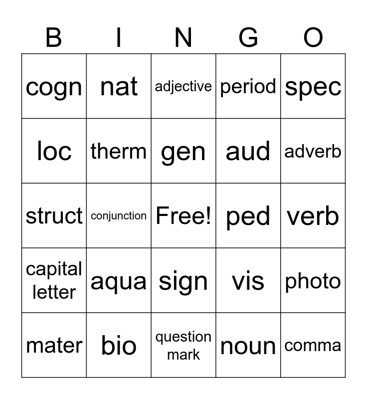 This bingo card has a free space and 24 words: aqua, bio, gen, mater, spec, cogn, loc, nat, ped, sign, aud, struct, vis, photo, therm, noun, verb, adjective, adverb, conjunction, comma, capital letter, period and question mark.