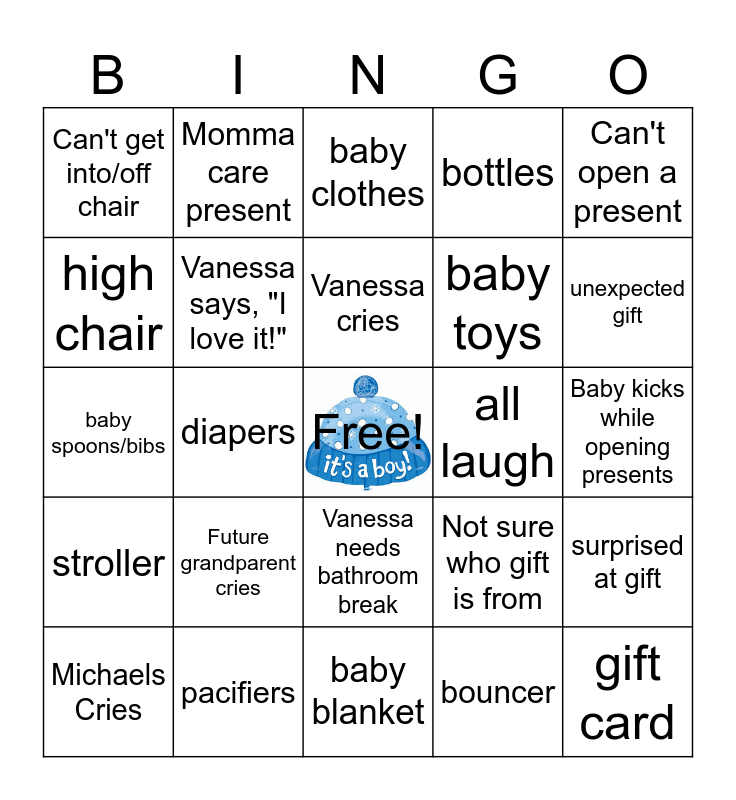 This bingo card has a free space and 24 words: Future grandparent cries, pacifiers, Vanessa cries, Michaels Cries, Can't open a present, Can't get into/off chair, high chair, Momma care present, all laugh, Vanessa needs bathroom break, baby toys, baby spoons/bibs, Not sure who gift is from, surprised at gift, Vanessa says, "I love it!", bouncer, Baby kicks while opening presents, baby clothes, unexpected gift, diapers, gift card, stroller, bottles and baby blanket.
