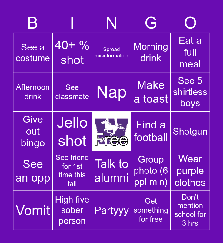This bingo card has a free space and 38 words: Convince a stranger they remember you, Wear purple accessory, Spot borg, See classmate, Wear purple clothes, See friend for 1st time this fall, Nap, Finish a water bottle, Eat a full meal, Make a toast, Jello shot, Morning drink, Don’t mention school for 3 hrs, Shotgun, Afternoon drink, See an opp, Sing a song with 3+ people, Spread misinformation, Keg stand, Find a football, See a costume, High five sober person, See 5 shirtless boys, Vomit, Fall on the floor, Partyyy, Get someones number, Selfie with police/security, Make a tiktok with a stranger, Kiss, Picture with hoco flag, Talk to alumni, Get something for free, 40+ % shot, Get offered alc/weed, Group photo (6 ppl min), Give out bingo and Tell a secret.