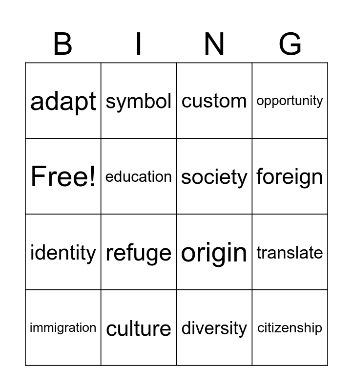 This bingo card has 16 words: culture, translate, custom, adapt, identity, symbol, origin, diversity, Free!, education, immigration, opportunity, refuge, foreign, society and citizenship.
