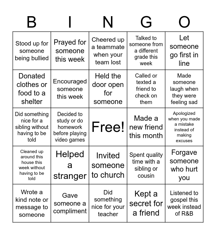 This bingo card has a free space and 24 words: Helped a stranger, Gave someone a compliment, Held the door open for someone, Wrote a kind note or message to someone, Let someone go first in line, Stood up for someone being bullied, Donated clothes or food to a shelter, Prayed for someone this week, Made a new friend this month, Invited someone to church, Called or texted a friend to check on them, Did something nice for a sibling without having to be told, Spent quality time with a sibling or cousin, Forgave someone who hurt you, Encouraged someone this week, Kept a secret for a friend, Apologized when you made a mistake instead of making excuses, Cheered up a teammate when your team lost, Made someone laugh when they were feeling sad, Decided to study or do homework before playing video games, Listened to gospel this week instead of R&B, Cleaned up around this house this week without having to be told, Talked to someone from a different grade this week and Did something nice for your teacher.