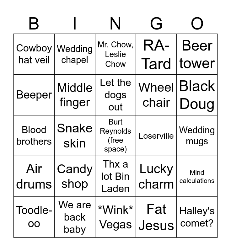 This bingo card has a free space and 35 words: Watch it pervert!, Except for herpes, PAGING DR., Middle finger, Thx a lot Bin Laden, RA-Tard, Beeper, REAL Caesars Palace, Let the dogs out, Satchel, Blood brothers, Beer tower, Missing tooth, Driving drunk, classic, Cowboy hat veil, Loserville, Fat Jesus, Snake skin, Air drums, Halley's comet?, Lucky charm, Toodle-oo, Mind calculations, We are back baby, Mr. Chow, Leslie Chow, Black Doug, So long gay boys, Rapies, Wheel chair, Wedding mugs, The Tux Shop, *Wink* Vegas, Candy shop, Wedding chapel and Digital camera.
