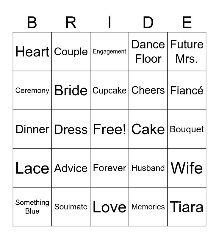 This bingo card has a free space and 60 words: Adventure, Advice, Aisle, Altar, Bouquet, Bow, Bride, Bridesmaids, Cake, Centerpiece, Ceremony, Champagne, Cheers, Chocolate, Cocktails, Couple, Cupcake, Dance Floor, Dessert, Dinner, Dress, Engagement, Family, Fiancé, First Dance, Flowers, Forever, Friends, Future Mrs., Gifts, Groom, Groomsmen, Happily Ever After, Happiness, Heart, Honeymoon, Hugs, Husband, Kiss, Lace, Laughter, Love, Memories, Party, Proposal, Reception, Ribbon, Ring, Romance, Something Blue, Soulmate, Sparkle, Sweetheart, Tiara, Toast, Tuxedo, Veil, Vows, Wife and Wine.