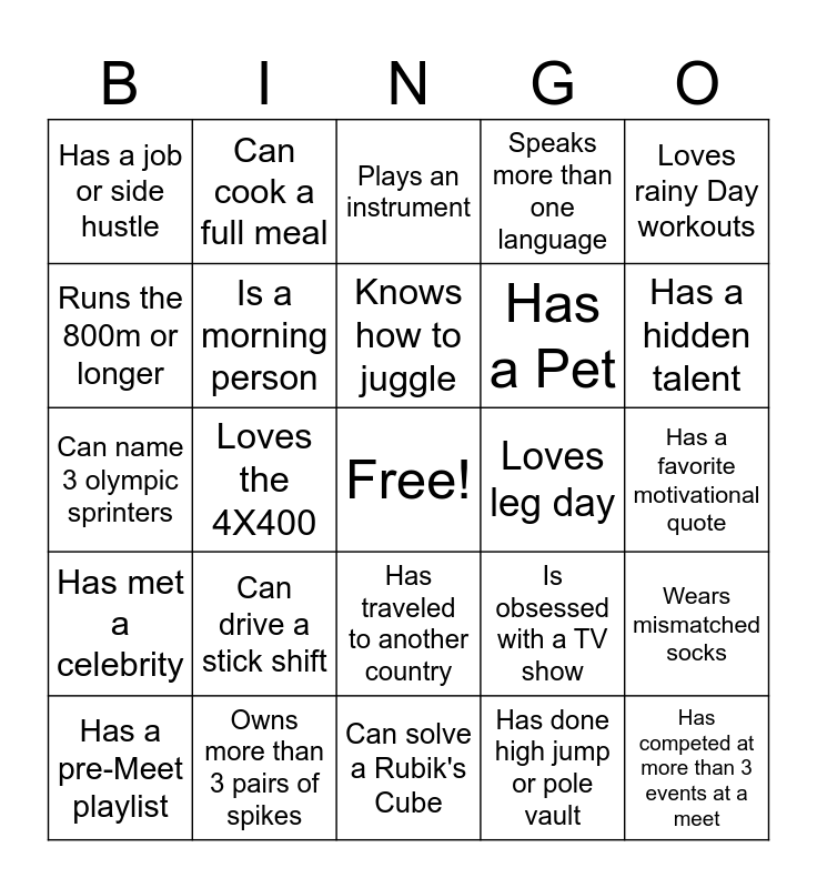 This bingo card has a free space and 24 words: Can drive a stick shift, Owns more than 3 pairs of spikes, Knows how to juggle, Has a pre-Meet playlist, Loves rainy Day workouts, Has a job or side hustle, Runs the 800m or longer, Can cook a full meal, Loves leg day, Has traveled to another country, Has a Pet, Can name 3 olympic sprinters, Is obsessed with a TV show, Wears mismatched socks, Is a morning person, Has done high jump or pole vault, Has a favorite motivational quote, Plays an instrument, Has a hidden talent, Loves the 4X400, Has competed at more than 3 events at a meet, Has met a celebrity, Speaks more than one language and Can solve a Rubik's Cube.