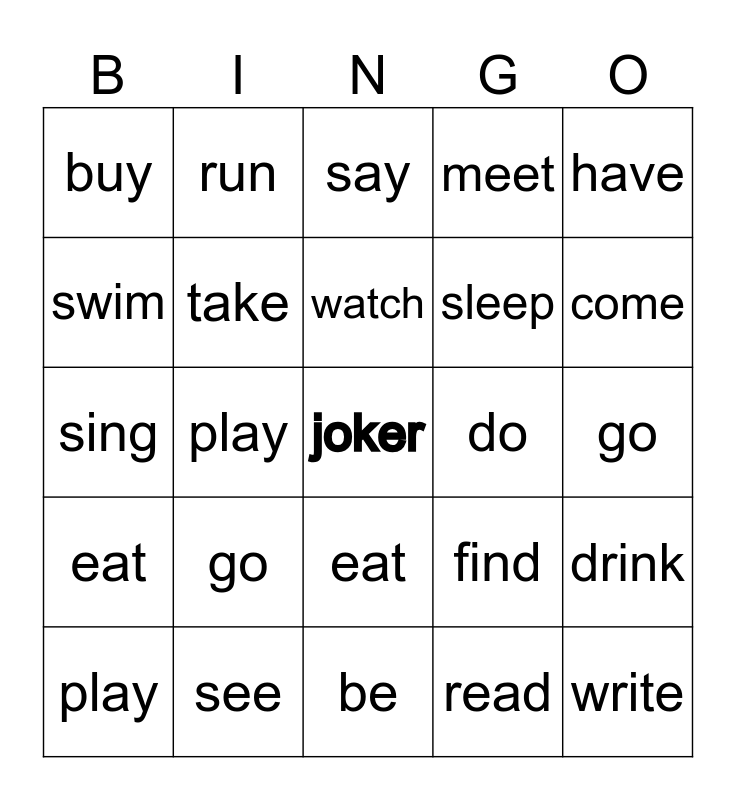 This bingo card has a free space and 24 words: go, see, watch, play, have, buy, swim, run, do, eat, sleep, sing, find, drink, take, read, go, say, come, play, write, eat, meet and be.