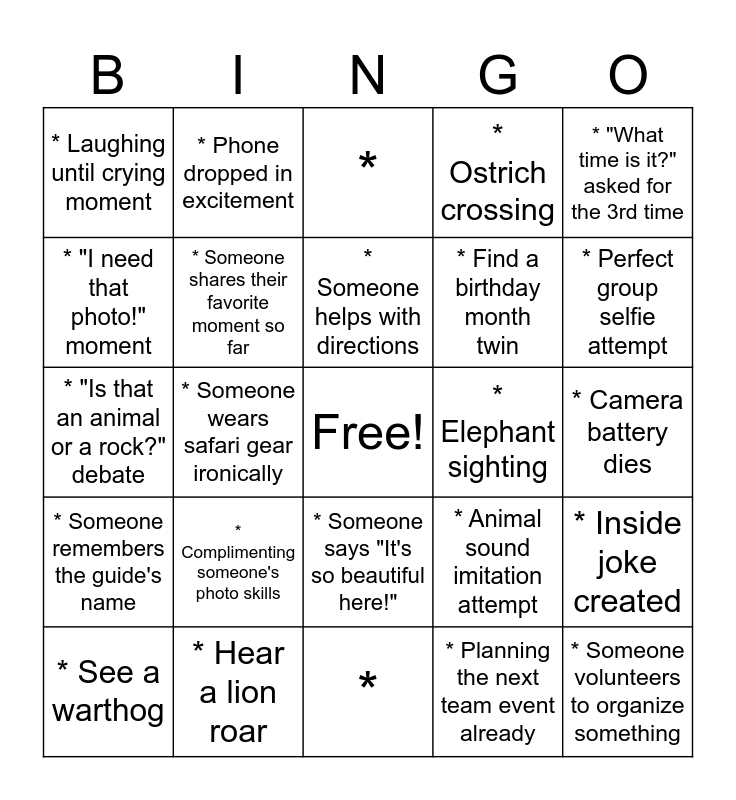 This bingo card has a free space and 42 words: * First person to spot an animal, * Someone helps with directions, * Sharing sunscreen/bug spray, * Complimenting someone's photo skills, * Planning the next team event already, * Inside joke created, * Someone volunteers to organize something, * Genuine "thank you for organizing this" moment, *, * Someone says "It's so beautiful here!", * Camera battery dies, * Perfect group selfie attempt, * Someone wears safari gear ironically, * "What time is it?" asked for the 3rd time, * Someone gets a perfect marshmallow toast, * Animal sound imitation attempt, * Someone quotes The Lion King, * "Is that an animal or a rock?" debate, * Someone falls asleep on the game drive, * Phone dropped in excitement, * "I need that photo!" moment, * Someone shares their snack, * Perfect sunset photo taken, * Laughing until crying moment, * Find someone who's never been on a safari, * Someone shares an animal fact, * Find a birthday month twin, * Someone admits they packed too much, * Find who has the same pizza topping preference, * Someone takes a photo for you, * Find the coffee addict, * Someone remembers the guide's name, * Someone shares their favorite moment so far, *, * Spot a giraffe, * See a warthog, * Hear a lion roar, * Elephant sighting, * Rhino spotted, * Herd of springbok, * Ostrich crossing and *.