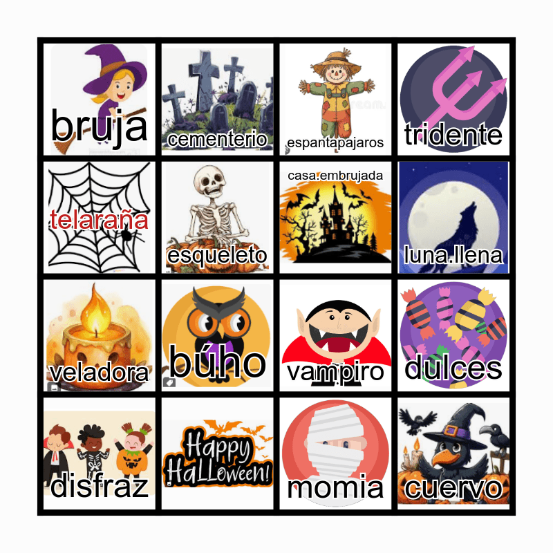 This bingo card has 26 images and 23 words: calabaza, fantasma, luna.llena, araña, telaraña, bruja, esqueleto, cementerio, momia, veladora, vampiro, lápida, huesos, dulces, bolsa.de.dulces, tridente, cuervo, espantapajaros, disfraz, búho, monstruo, casa.embrujada and murcielago.