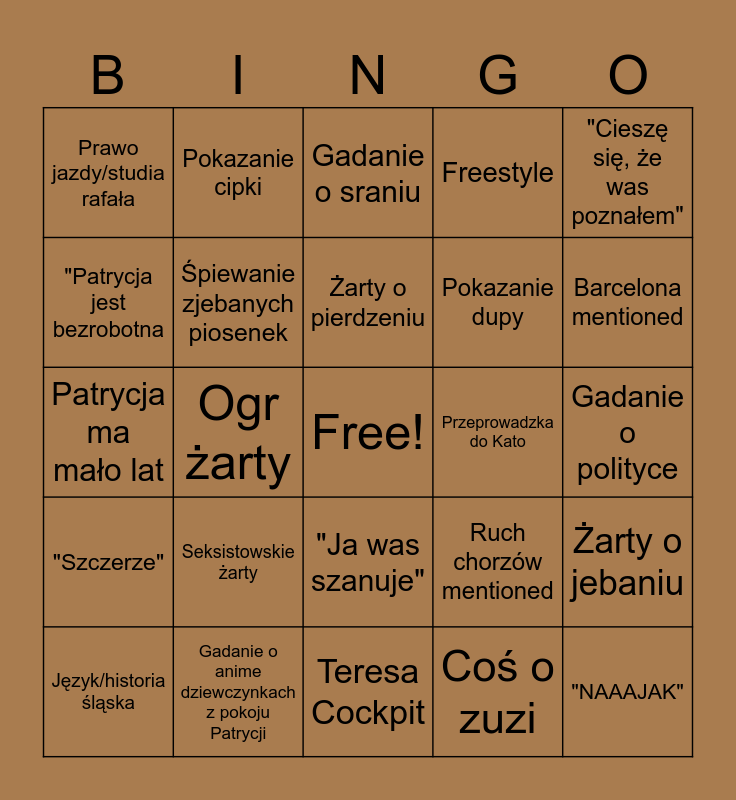 This bingo card has a free space and 24 words: Język/historia śląska, Seksistowskie żarty, Żarty o pierdzeniu, Coś o zuzi, "Cieszę się, że was poznałem", Prawo jazdy/studia rafała, Pokazanie cipki, Gadanie o sraniu, Przeprowadzka do Kato, Gadanie o polityce, Patrycja ma mało lat, Śpiewanie zjebanych piosenek, Ruch chorzów mentioned, Żarty o jebaniu, "Patrycja jest bezrobotna, Gadanie o anime dziewczynkach z pokoju Patrycji, Teresa Cockpit, Freestyle, Barcelona mentioned, "Szczerze", Ogr żarty, "Ja was szanuje", Pokazanie dupy and "NAAAJAK".