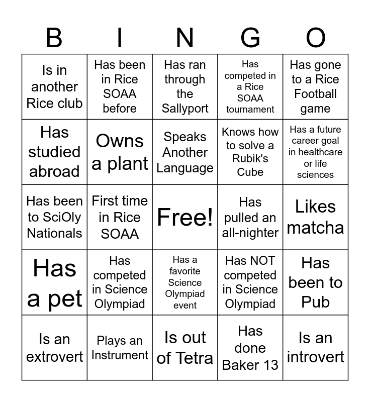 This bingo card has a free space and 24 words: Has competed in Science Olympiad, Plays an Instrument, Speaks Another Language, Is an extrovert, Has gone to a Rice Football game, Is in another Rice club, Has studied abroad, Has been in Rice SOAA before, Has pulled an all-nighter, Has a favorite Science Olympiad event, Knows how to solve a Rubik's Cube, Has been to SciOly Nationals, Has NOT competed in Science Olympiad, Has been to Pub, Owns a plant, Has done Baker 13, Likes matcha, Has ran through the Sallyport, Has a future career goal in healthcare or life sciences, First time in Rice SOAA, Is an introvert, Has a pet, Has competed in a Rice SOAA tournament and Is out of Tetra.