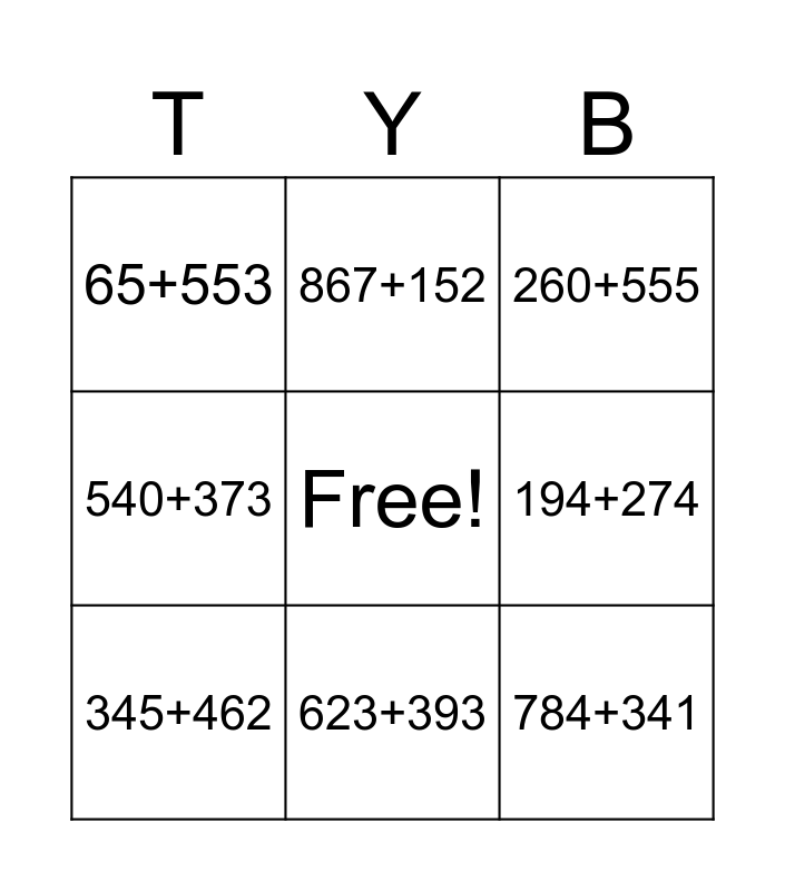 This bingo card has a free space and 11 words: 535+278, 623+393, 784+341, 345+462, 867+152, 260+555, 194+274, 466+91, 540+373, 65+553 and 176+62.