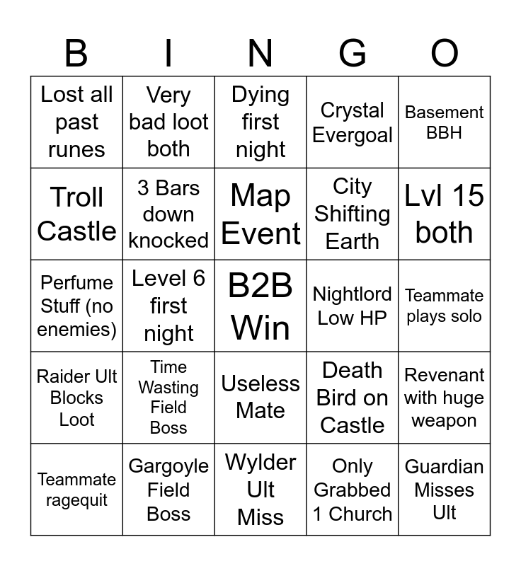 This bingo card has a free space and 24 words: Time Wasting Field Boss, Gargoyle Field Boss, Map Event, Teammate ragequit, Basement BBH, Lost all past runes, Troll Castle, Very bad loot both, Nightlord Low HP, Useless Mate, City Shifting Earth, Perfume Stuff (no enemies), Death Bird on Castle, Revenant with huge weapon, 3 Bars down knocked, Only Grabbed 1 Church, Teammate plays solo, Dying first night, Lvl 15 both, Level 6 first night, Guardian Misses Ult, Raider Ult Blocks Loot, Crystal Evergoal and Wylder Ult Miss.