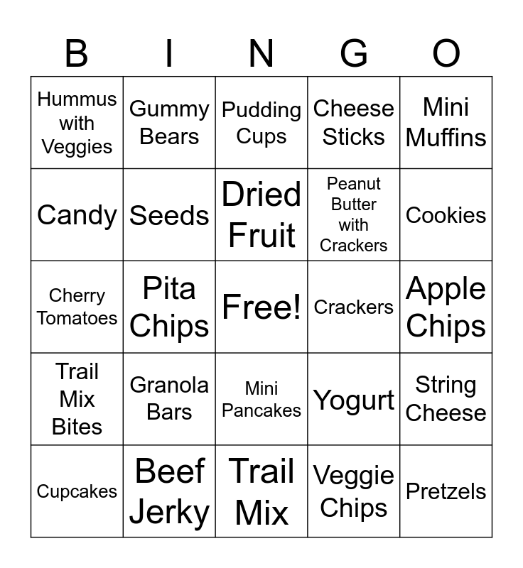 This bingo card has a free space and 51 words: Chips, Pretzels, Popcorn, Trail Mix, Granola Bars, Fruit Snacks, Gummy Bears, Chocolate Bars, Candy, Nuts, Seeds, Cheese Sticks, String Cheese, Yogurt, Applesauce, Fresh Fruit, Dried Fruit, Crackers, Rice Cakes, Mini Muffins, Pita Chips, Veggie Chips, Hummus with Veggies, Peanut Butter with Crackers, Bagel with Cream Cheese, Mini Donuts, Cookies, Brownies, Cupcakes, Pudding Cups, Jello Cups, Smoothies, Ice Cream, Frozen Fruit Pops, Chex Mix, Beef Jerky, Pop-Tarts, Cereal Bars, Oatmeal Cookies, Banana Bread, Apple Chips, Trail Mix Bites, Pretzel Sticks, Carrot Sticks, Celery Sticks, Cucumber Slices, Cherry Tomatoes, Bell Pepper Strips, Edamame, Mini Pancakes and Mini Waffles.