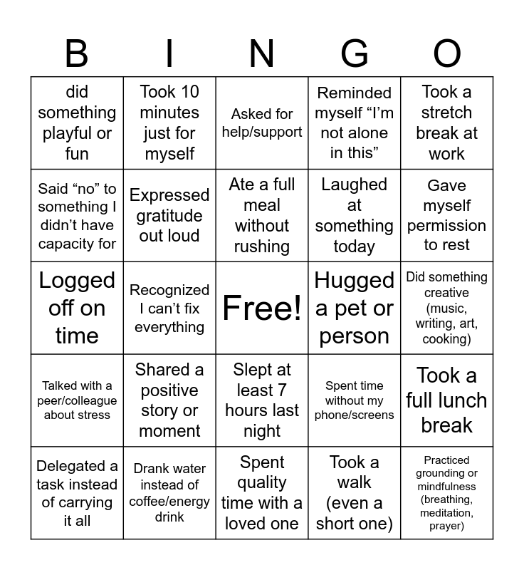This bingo card has a free space and 26 words: Slept at least 7 hours last night, Took a walk (even a short one), Ate a full meal without rushing, Drank water instead of coffee/energy drink, Took a stretch break at work, did something playful or fun, Said “no” to something I didn’t have capacity for, Took 10 minutes just for myself, Did something creative (music, writing, art, cooking), Spent time without my phone/screens, Laughed at something today, Logged off on time, Took a full lunch break, Delegated a task instead of carrying it all, Recognized I can’t fix everything, Used PTO, break, or personal time without guilt, Reminded myself “I’m not alone in this”, Talked with a peer/colleague about stress, Asked for help/support, Practiced grounding or mindfulness (breathing, meditation, prayer), Gave myself permission to rest, Spent quality time with a loved one, Hugged a pet or person, Shared a positive story or moment, Expressed gratitude out loud and Did something playful or fun.