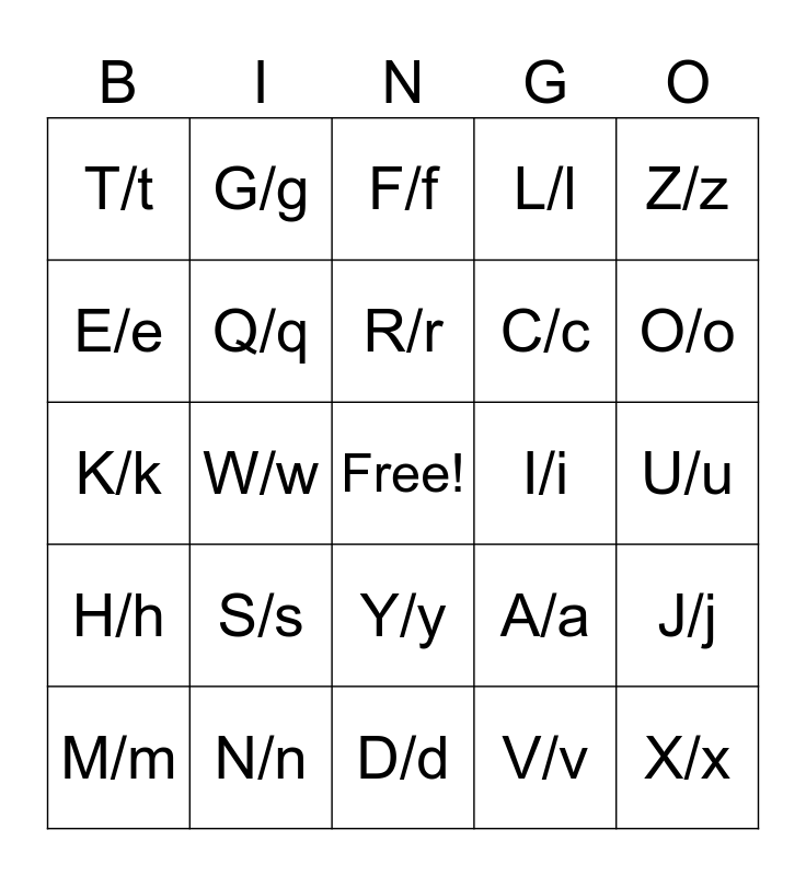 This bingo card has a free space and 27 words: A/a, B/b, C/c, D/d, E/e, F/f, G/g, H/h, I/i, J/j, K/k, L/l, M/m, N/n, O/o, P/p, Q/q, R/r, S/s, T/t, U/u, V/v, W/w, X/x, Y/y, Z/z and K, L, M, N, O, P, Q, R, S, T.