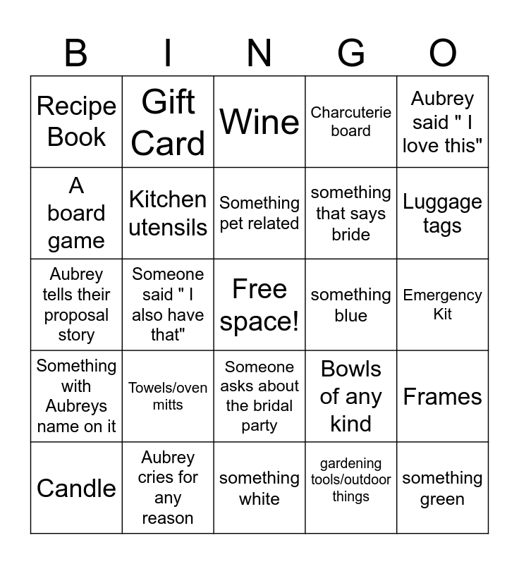 This bingo card has a free space and 24 words: Towels/oven mitts, Aubrey cries for any reason, Something pet related, Candle, Aubrey said " I love this", Recipe Book, A board game, Gift Card, something blue, Someone asks about the bridal party, something that says bride, Aubrey tells their proposal story, Bowls of any kind, Frames, Kitchen utensils, gardening tools/outdoor things, Emergency Kit, Wine, Luggage tags, Someone said " I also have that", something green, Something with Aubreys name on it, Charcuterie board and something white.