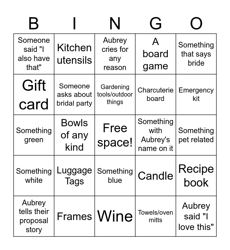 This bingo card has a free space and 24 words: Luggage Tags, Frames, Gardening tools/outdoor things, Aubrey tells their proposal story, Something that says bride, Someone said "I also have that", Gift card, Kitchen utensils, Something with Aubrey's name on it, Something blue, Charcuterie board, Something green, Candle, Recipe book, Someone asks about bridal party, Towels/oven mitts, Something pet related, Aubrey cries for any reason, Emergency kit, Bowls of any kind, Aubrey said "I love this", Something white, A board game and Wine.