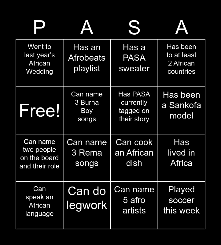 This bingo card has 16 words: Can do legwork, Has lived in Africa, Has a PASA sweater, Went to last year's African Wedding, Can name two people on the board and their role, Has an Afrobeats playlist, Can cook an African dish, Can name 5 afro artists, Free!, Can name 3 Burna Boy songs, Can speak an African language, Has been to at least 2 African countries, Can name 3 Rema songs, Has been a Sankofa model, Has PASA currently tagged on their story and Played soccer this week.