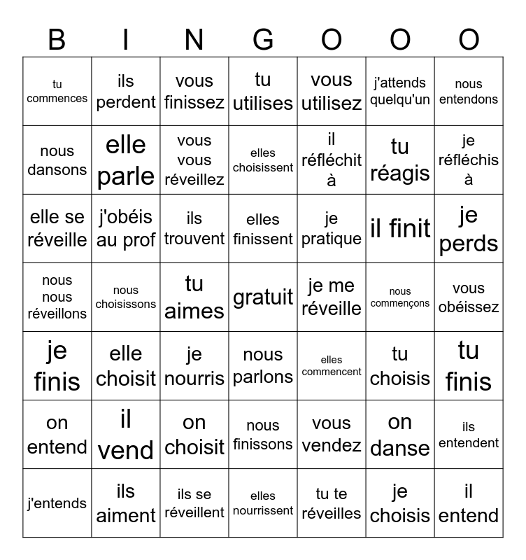 This bingo card has a free space and 48 words: vous vendez, tu réagis, elles nourrissent, nous choisissons, ils trouvent, vous obéissez, ils perdent, ils aiment, j'attends quelqu'un, nous parlons, nous entendons, tu utilises, il finit, je pratique, on entend, nous commençons, nous dansons, je réfléchis à, on danse, vous utilisez, il réfléchit à, tu aimes, tu commences, elle parle, ils entendent, vous vous réveillez, je perds, j'entends, elles finissent, j'obéis au prof, je choisis, je me réveille, tu finis, il vend, nous nous réveillons, elles commencent, tu choisis, elle se réveille, je nourris, on choisit, je finis, il entend, vous finissez, ils se réveillent, elles choisissent, nous finissons, elle choisit and tu te réveilles.