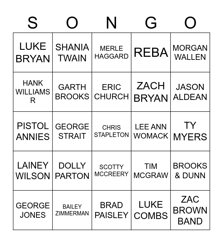This bingo card has 51 words: KENNY ROGERS, CHRIS STAPLETON, KEITH URBAN, BRAD PAISLEY, DOLLY PARTON, MARTINA MCBRIDE, SHANIA TWAIN, TOBY KEITH, HANK WILLIAMS R, ALABAMA, GARTH BROOKS, REBA, BROOKS & DUNN, TIM MCGRAW, THE JUDDS, AMEY JOHNSON, ERIC CHURCH, LEE ANN WOMACK, TANYA TUCKER, MORGAN WALLEN, GEORGE STRAIT, LUKE COMBS, LUKE BRYAN, ZACH BRYAN, ALAN JACKSON, ZAC BROWN BAND, JASON ALDEAN, KENNY CHESNEY, GEORGE JONES, MERLE HAGGARD, WAYLON JENNINGS, WILLIE NELSON, THOMAS RHETT, KANE BROWN, BLAKE SHELTON, BAILEY ZIMMERMAN, RILEY GREEN, SHABOOZEY, HARDY, MIRANDA LAMBERT, TY MYERS, LAINEY WILSON, JELLY ROLL, RASCAL FLATTS, BRANTLEY GILBERT, DAVID ALLAN COE, PISTOL ANNIES, NATE SMITH, WALKER HAYES, SCOTTY MCCREERY and RED CLAY STRAYS.