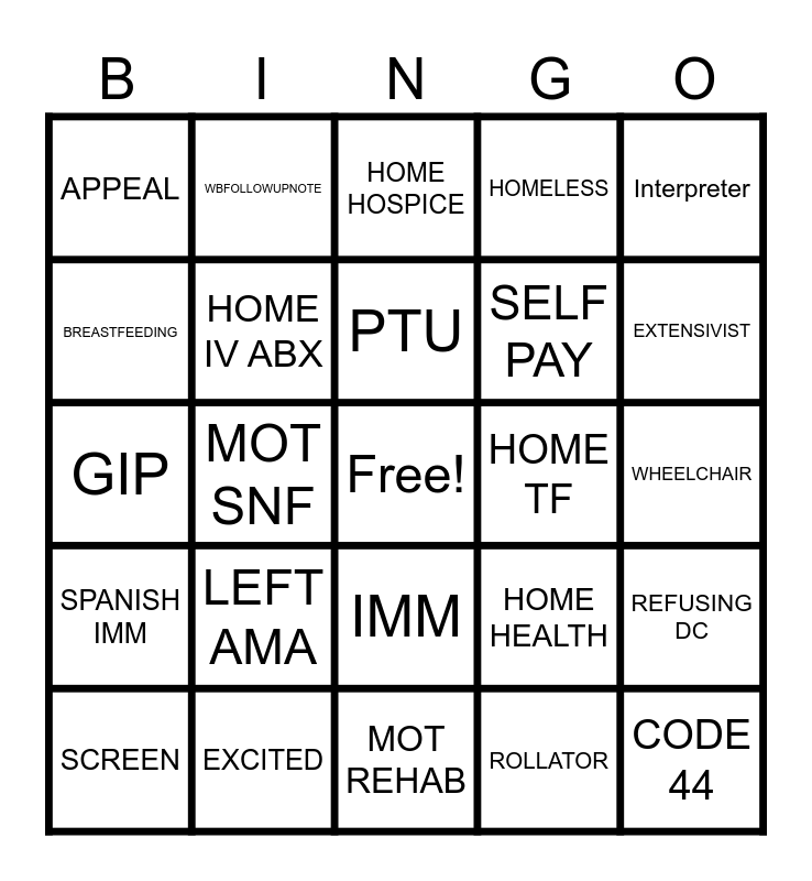 This bingo card has a free space and 31 words: MOT REHAB, MOT REHAB, MOT SNF, PASRR, APPEAL, HOME HOSPICE, HOME IV ABX, HOME HEALTH, HOME TF, ROLLATOR, WHEELCHAIR, CODE 44, CM LEADERSHIP, DR NORTON, EXTENSIVIST, CHF, REFUSING DC, LEFT AMA, SPANISH IMM, IMM, Interpreter, IA, SCREEN, WBFOLLOWUPNOTE, SELF PAY, BREASTFEEDING, HOMELESS, GIP, EXCITED, PTU and COMPASS.