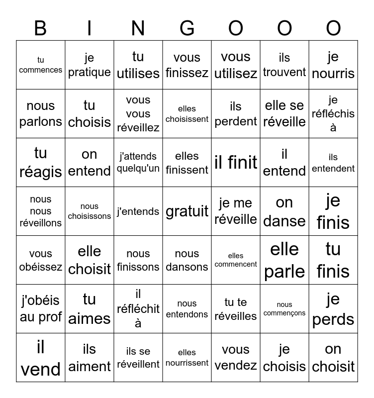 This bingo card has a free space and 48 words: tu te réveilles, elle se réveille, elles nourrissent, nous choisissons, j'attends quelqu'un, je finis, je pratique, ils aiment, ils trouvent, nous dansons, je nourris, vous finissez, il entend, il finit, j'obéis au prof, on danse, nous parlons, je réfléchis à, nous commençons, vous utilisez, ils perdent, j'entends, tu commences, tu choisis, je perds, vous vous réveillez, ils entendent, il vend, elles finissent, on entend, je choisis, je me réveille, tu finis, tu aimes, nous nous réveillons, elles commencent, elle parle, tu réagis, nous finissons, il réfléchit à, vous obéissez, on choisit, tu utilises, ils se réveillent, elles choisissent, nous entendons, elle choisit and vous vendez.