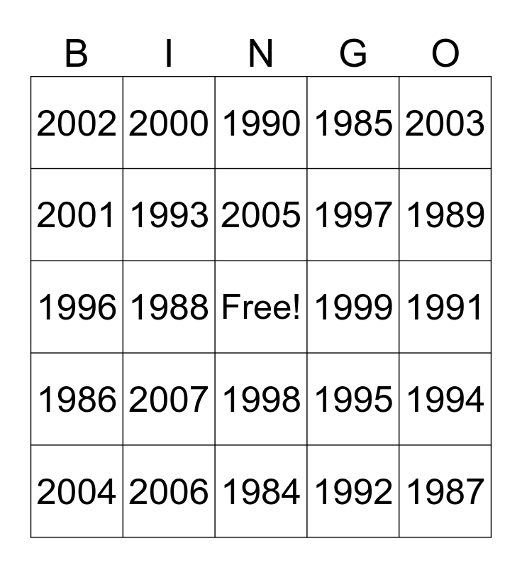 This bingo card has a free space and 24 words: 2007, 2006, 2005, 2004, 2003, 2002, 2001, 2000, 1999, 1998, 1997, 1996, 1995, 1994, 1993, 1992, 1991, 1990, 1989, 1988, 1987, 1986, 1985 and 1984.