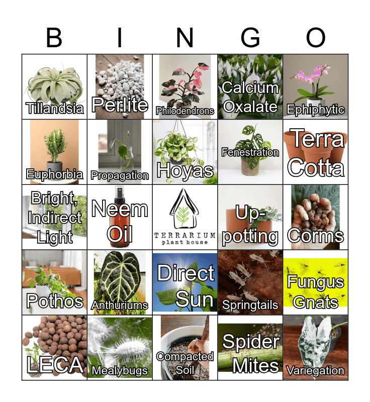 This bingo card has 34 images, a free space and 34 words: Carnivorous Plants, Spider Mites, Root Rot, Low Light, Pothos, Propagation, Ephiphytic, LECA, Perlite, Aphids, Hoyas, Philodendrons, Ferns, Climbing Poles, Up-potting, Terra Cotta, Mealybugs, Bright, Indirect Light, Anthuriums, Springtails, Direct Sun, Sansevieria, Tillandsia, Corms, Compacted Soil, Variegation, Calcium Oxalate, Tradescantia, Fenestration, Euphorbia, Aerial Roots, Neem Oil, Fungus Gnats and Grow Light.