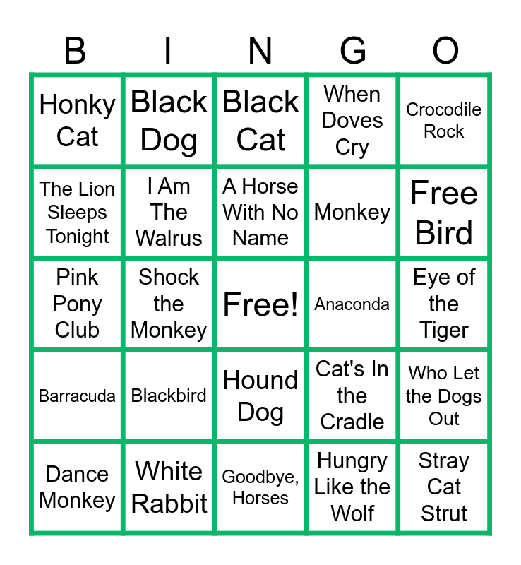 This bingo card has a free space and 24 words: Blackbird, White Rabbit, A Horse With No Name, Dance Monkey, Crocodile Rock, Honky Cat, The Lion Sleeps Tonight, Black Dog, Anaconda, Hound Dog, Monkey, Pink Pony Club, Cat's In the Cradle, Who Let the Dogs Out, I Am The Walrus, Hungry Like the Wolf, Eye of the Tiger, Black Cat, Free Bird, Shock the Monkey, Stray Cat Strut, Barracuda, When Doves Cry and Goodbye, Horses.