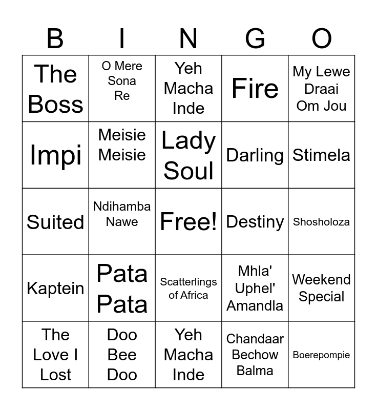 This bingo card has a free space and 31 words: Yeh Macha Inde, Africa, Ndihamba Nawe, Sobabili, The Boss, Yeh Macha Inde, Meisie Meisie, Mhla' Uphel' Amandla, Destiny, Chandaar Bechow Balma, Shosholoza, Boerepompie, Sista Bethina, Special Star, Stimela, Nkalakatha, Weekend Special, Pata Pata, Kaptein, Scatterlings of Africa, My Lewe Draai Om Jou, Superhero, The Love I Lost, O Mere Sona Re, Darling, Impi, Fire, Suited, Doo Bee Doo, Lady Soul and Soos Bloed.