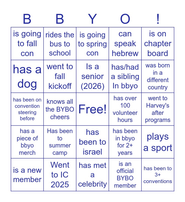 This bingo card has a free space and 24 words: Has been to summer camp, Went to IC 2025, Is a senior (2026), is a new member, is on chapter board, is going to fall con, has a dog, rides the bus to school, has over 100 volunteer hours, has been to israel, has/had a sibling In bbyo, has been on convention steering before, has been in bbyo for 2+ years, plays a sport, went to fall kickoff, is an official BYBO member, went to Harvey's after programs, is going to spring con, was born in a different country, knows all the BYBO cheers, has been to 3+ conventions, has a piece of bbyo merch, can speak hebrew and has met a celebrity.